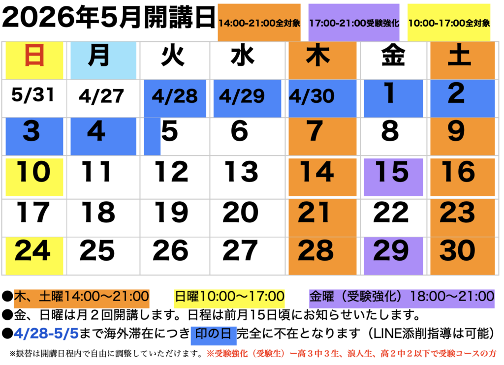 - 教室見学は、開講日の授業時間内のみご案内しています